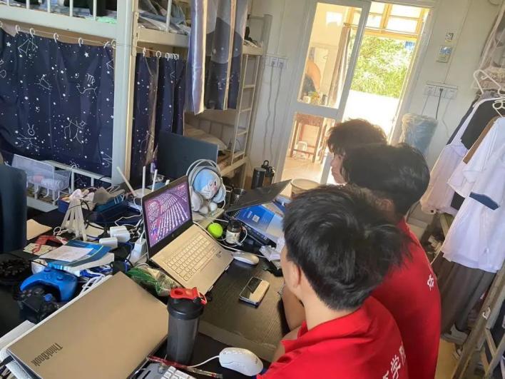 2022级员工冯克宝、金琬璕与广西射击射箭运动发展中心射箭队队友一起观看党的二十大直播