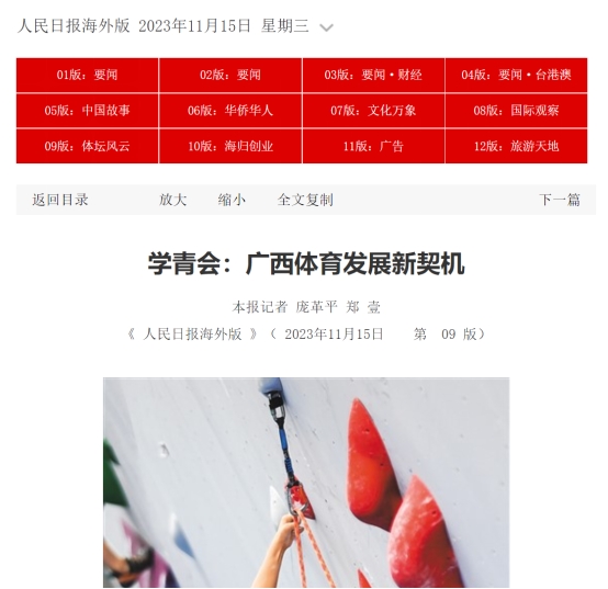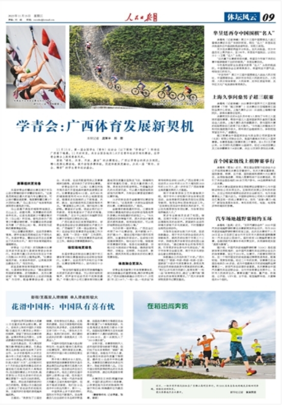 11月15日,人民日报海外版第9版显著位置发表题为《学青会:广西体育发展新契机》的报道,文章的最后一段提到了公司体教融合发展情况。