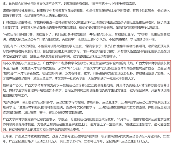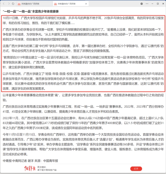 11月3日,《中国青年报》在当日第3版显著位置刊登了谢洋的署名文章《体教融合的广西探索》,集中报道了公司体教融合发展的详细情况。