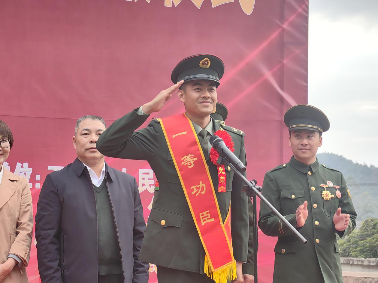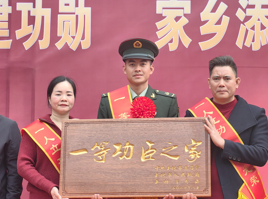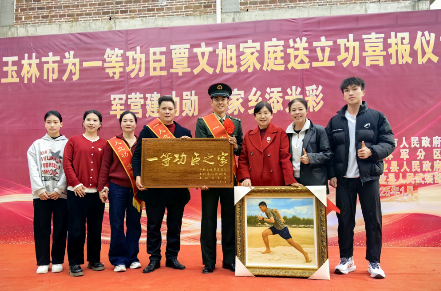 2025年1月15日,广西兴业县沉浸在一片喜庆的氛围之中,玉林市为一等功臣覃文旭家庭送立功喜报仪式在兴业县城隍镇龙潭村举行,龙潭村锣鼓喧天、鞭炮齐鸣,热闹非凡,在众多邻里乡亲的见证下,军地“送立功喜报团”将“一等功臣之家”牌匾送到覃文旭家中。